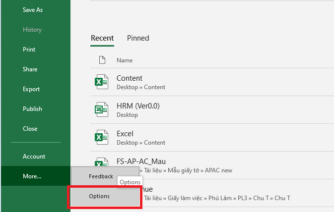 Bước 2: Tiếp theo, các bạn mở một file Excel bất kỳ lên. Sau đó chọn thẻ File trên thanh công cụ. Tiếp theo các bạn nhấn vào Options tại góc dưới bên trái màn hình.