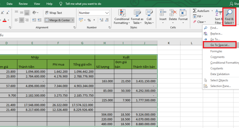 - Bước 2: Nhấn Ctrl + G để mở Go To Special (hoặc chọn thẻ Home > Chọn Find & Select > Go To Special)