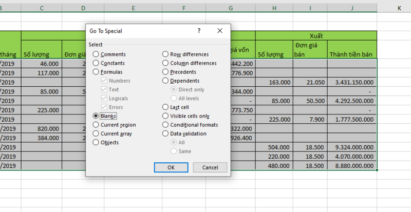 - Bước 4: Tích chọn Blank > Nhấn Ok để chọn tất cả các ô trống