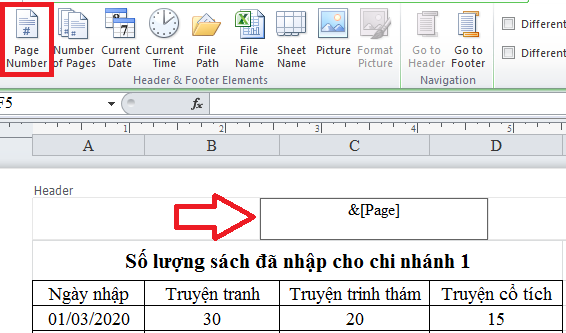 Tại mục Header & Footer Tools bạn hãy ấn vào biểu tượng Page Number. Ngay lập tức &[Page] sẽ được chèn vào vị trí mà bạn đã chọn. Đây là một trường biến đổi dùng để đánh số trang cho dữ liệu của bạn.