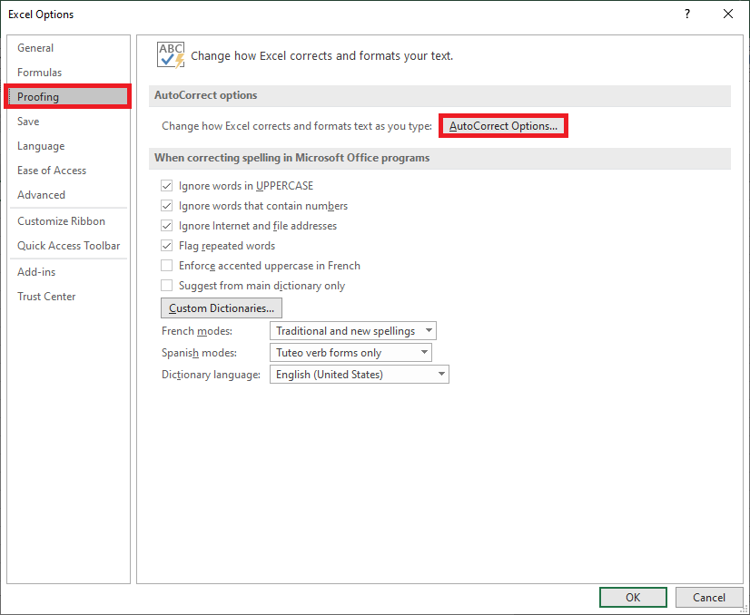 Bước 2: Trong hộp thoại hiện lên, chọn mục Proofing → bấm AutoCorrect Options….