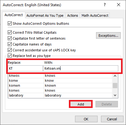 Bước 4: Trong cửa sổ AutoCorrect, nhập cụm viết tắt vào ô Replace và cụm từ đầy đủ vào ô With. Ví dụ: nhập KT làm viết tắt cho Ketoan.vn. Sau đó nhấn Add để lưu và có thể tiếp tục tạo thêm các cụm khác.