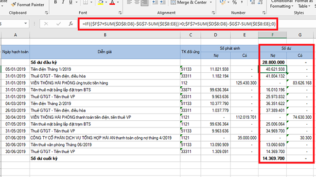 Sau đó, sao chép công thức xuống toàn bộ cột Nợ để tính được số dư Nợ cho tất cả các nghiệp vụ phát sinh.