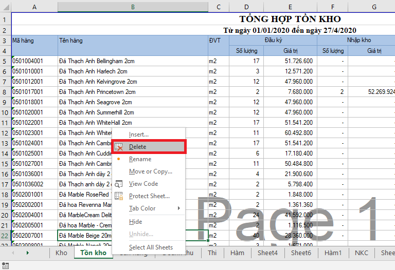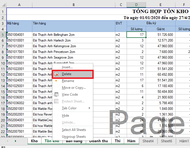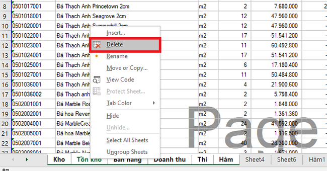 Sau đó các bạn nhấn chuột phải vào một sheet bất kỳ rồi chọn Delete. Chỉ cần như vậy là tất cả sheet được chọn sẽ được xóa đi một cách nhanh chóng.
