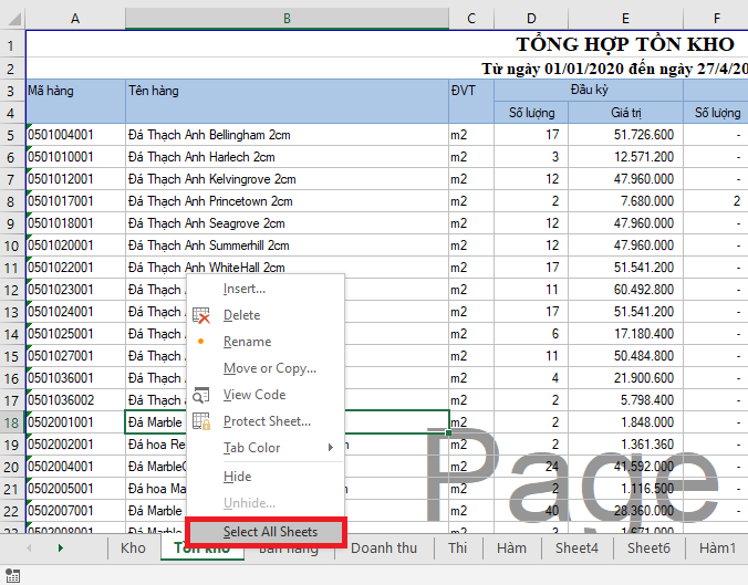 Hoặc nếu bạn muốn xóa tất cả sheet có trong file thì các bạn chỉ cần nhóm tất cả sheet có trong file vào một Group bằng cách nhấn chuột phải vào một sheet bất kỳ rồi chọn Select All Sheets. Sau đó các bạn nhấn chuột phải và chọn Delete như các cách trên là tất cả sheet trong file sẽ được xóa đi một cách dễ dàng.