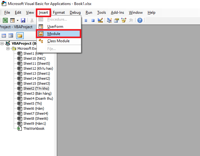 Tại cửa sổ VBA, các bạn chọn thẻ Insert => Module.