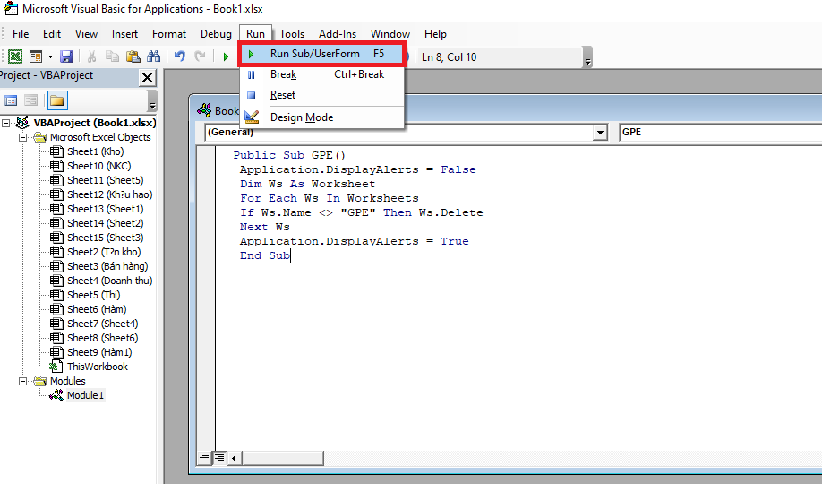 Sau đó các bạn nhấn Run hoặc nhấn F5 để chạy mã code. Chỉ cần như vậy là những sheet Excel không có tên là GPE sẽ được xóa đi một cách nhanh chóng.