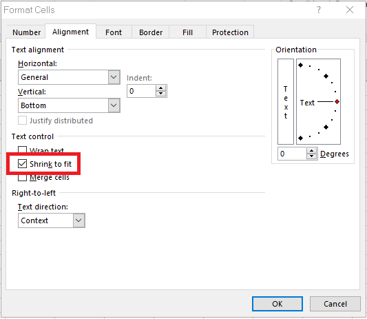 Khi hộp thoại Format Cells hiện ra, bạn chọn mục Alignment rồi tích chọn vào Shrink to fit. Sau đó ấn OK để lưu.