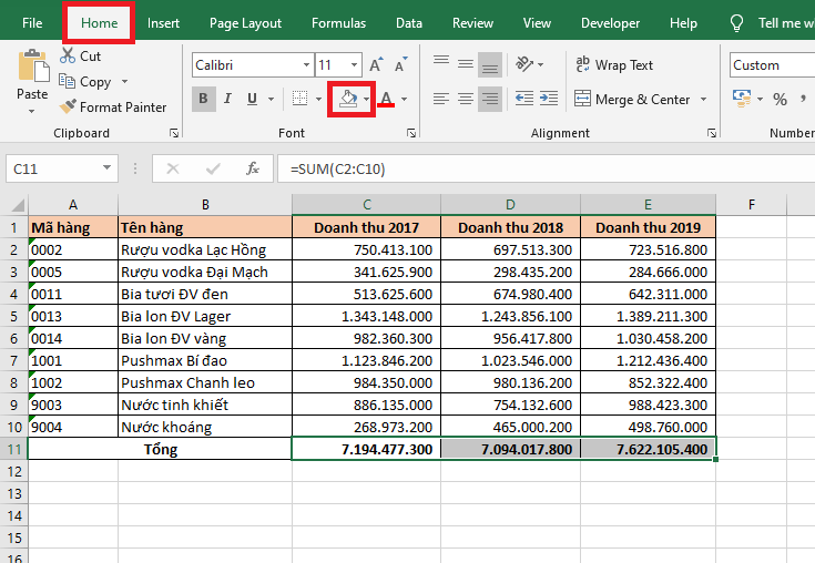 Bình thường để tô màu ô trong Excel: Bôi đen các ô cần tô màu => vào thẻ Home => chọn Fill Color => chọn màu cần tô.