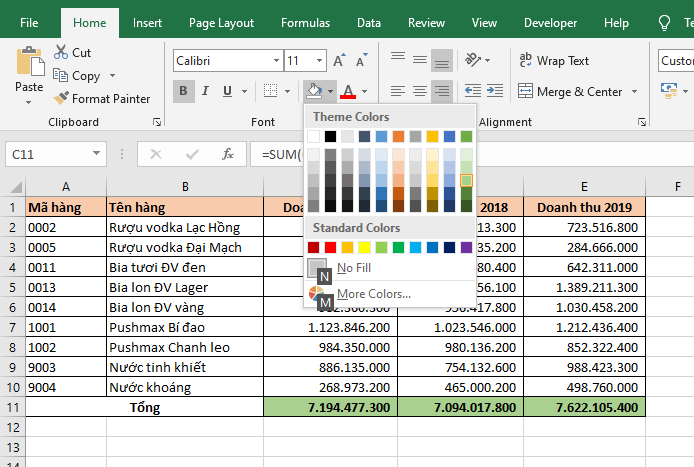 (Di chuyển mũi tên để chọn Theme Colors, Standard Colors, No Fill hoặc More Colors.) - Xóa màu nền (No Fill): Alt → H → H → chọn No Fill (mũi tên lên trái) → Enter