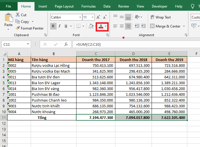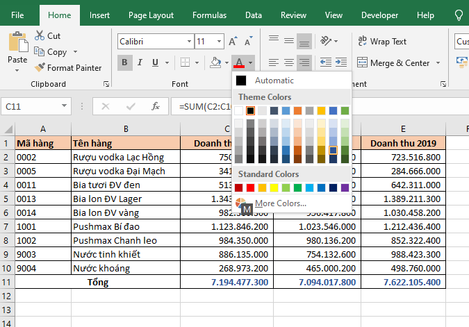Bôi đen ô cần tô màu chữ => Vào Home => Chọn Font Color => Chọn màu muốn tô