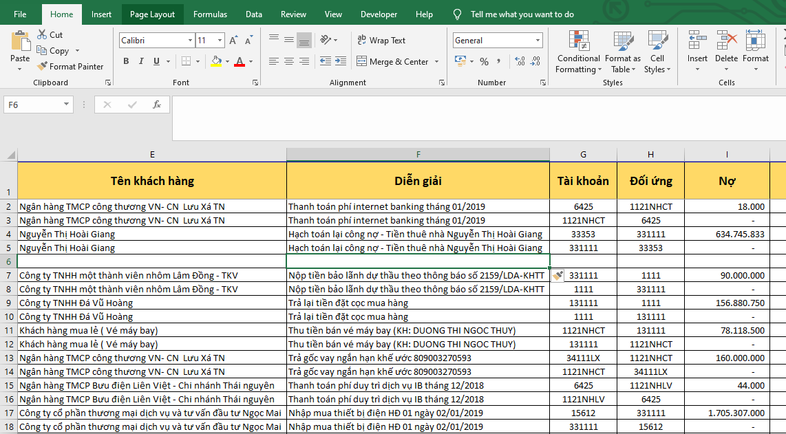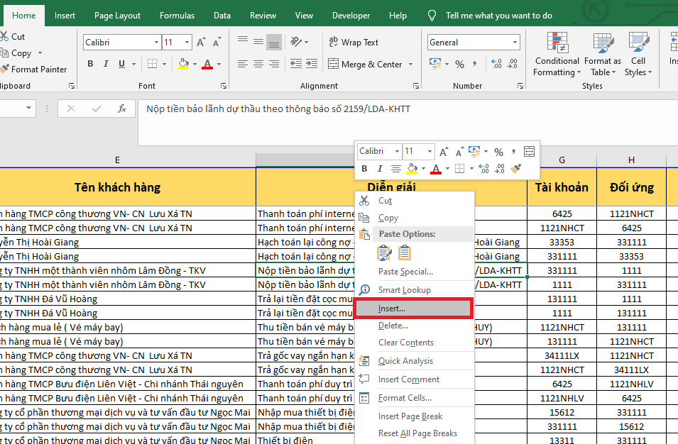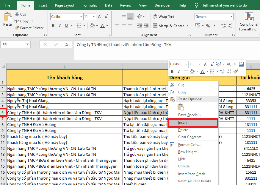 Ta đặt con trỏ chuột ở ô bất kỳ trong dòng cần chèn thêm dòng lên trên (ví dụ muốn chèn 1 dòng ở trên dòng 5 thì ta sẽ đặt trỏ chuột ở ô bất kỳ trong dòng 5 như C5 chẳng hạn).