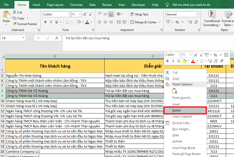 Để xóa dòng, ta đặt chuột tại ô bất kỳ ở dòng muốn xóa > sau đó click chuột phải rồi chọn Delete > khi hộp thoại Delete xuất hiện, ta chọn Entire Row để xóa dòng.