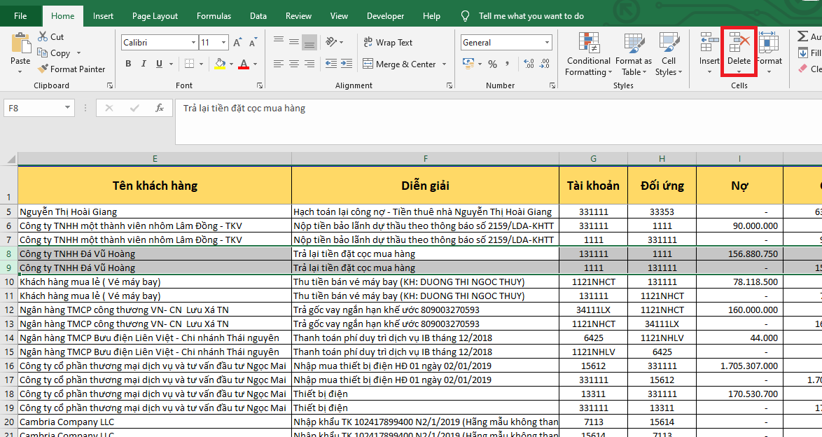 Để xóa dòng trong Excel ta chỉ cần kích hoạt công cụ Delete, để kích hoạt ta có 3 cách:
