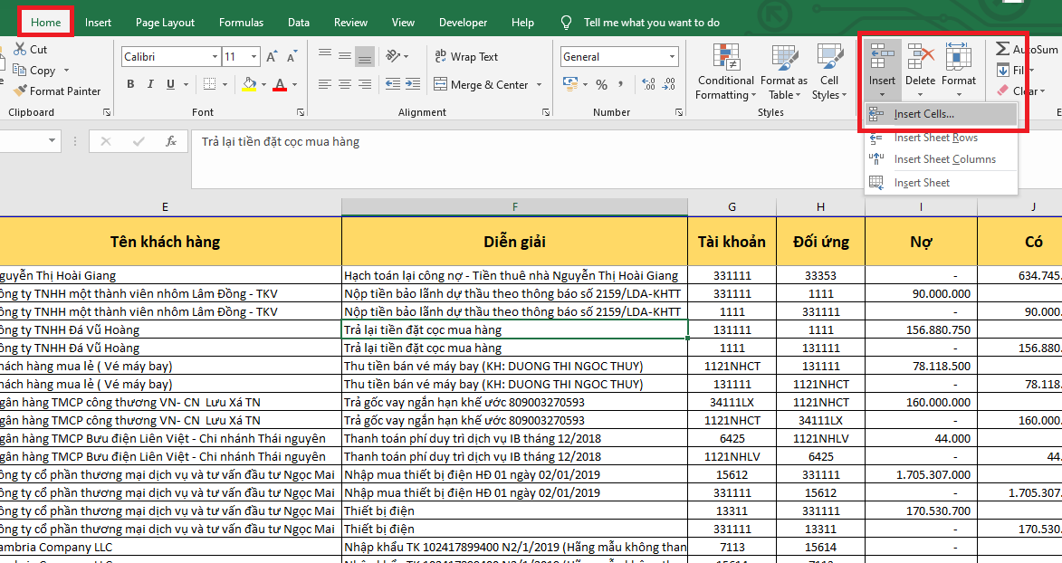 Để kích hoạt hộp thoại Insert và thêm dòng, sau khi đặt con trỏ chuột tại vị trí cần chèn thêm dòng mới lên trên > ta vào Home > chọn Insert > chọn Insert Cells để mở hộp thoại Insert > rồi chọn Entire Row > Ok để hoàn tất.