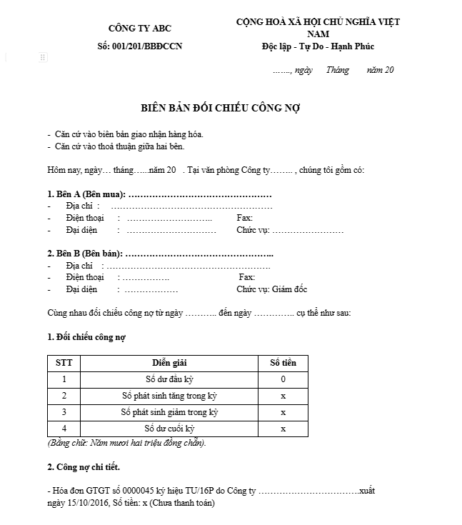 - Kết luận đối chiếu: Xác nhận số công nợ cuối cùng hai bên thống nhất, kèm thời hạn thanh toán nếu vẫn còn dư nợ.